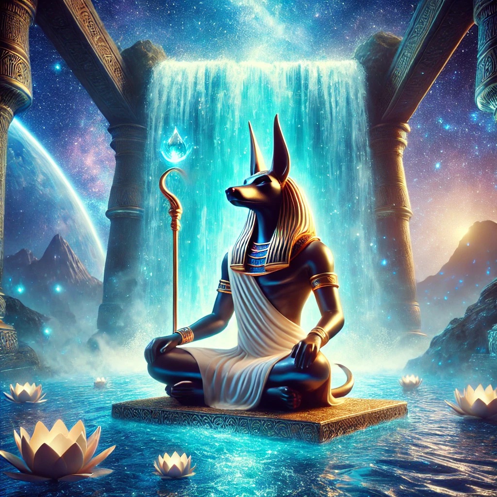 Seated in deep meditation, Anubis ascended beyond the mortal veil, rising to the throne at the peak of eternal consciousness. His astral form, adorned in royal garb, glowed with the presence of aeons past. In one hand, he held his staff a sceptre of command, resonant with the hum of creation itself. From this celestial seat, he called forth the elements, each one summoned in its purest, primordial state.