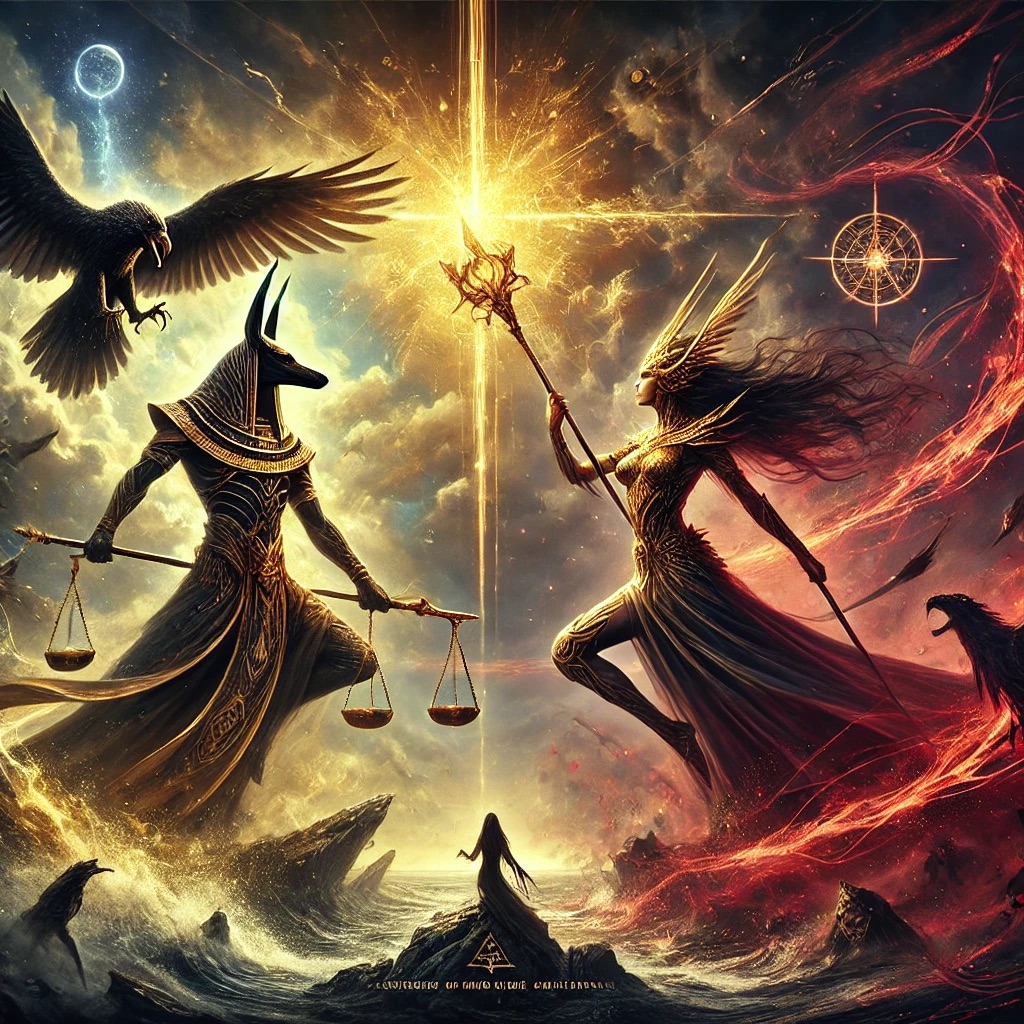 As they fought, the energies of war and judgment began to intertwine. The battlefield shimmered, and both deities paused, sensing the shift. Morrigan, the goddess of fate, tilted her head, her gaze narrowing. Anubis’s scales glowed brighter, their balance tipping neither left nor right but holding steady in the center.