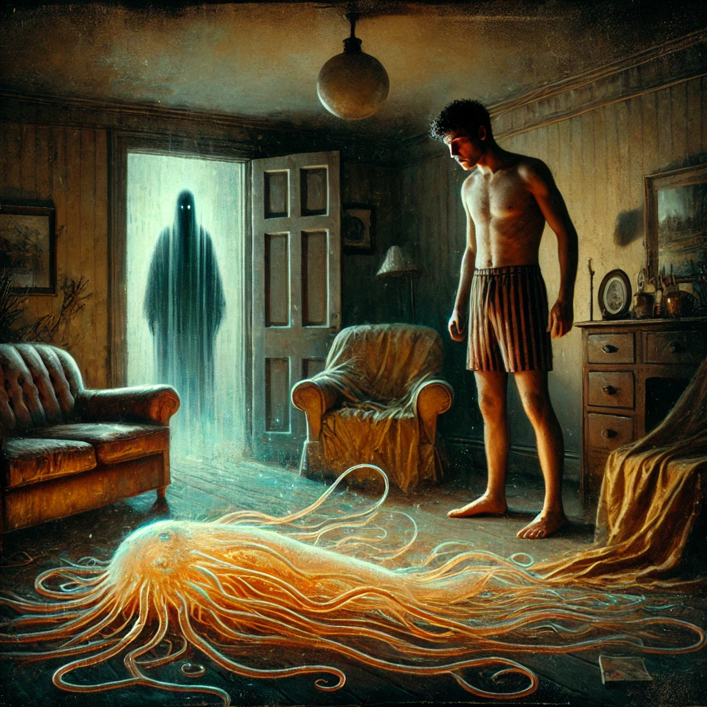He sat on the edge of a couch in a house he didn’t know, though it felt vaguely familiar. Dust clung to every surface, the air thick and stale, carrying a smell that was both ancient and suffocating. It hit him suddenly: this was his ex-girlfriend’s house, or it was trying to be.